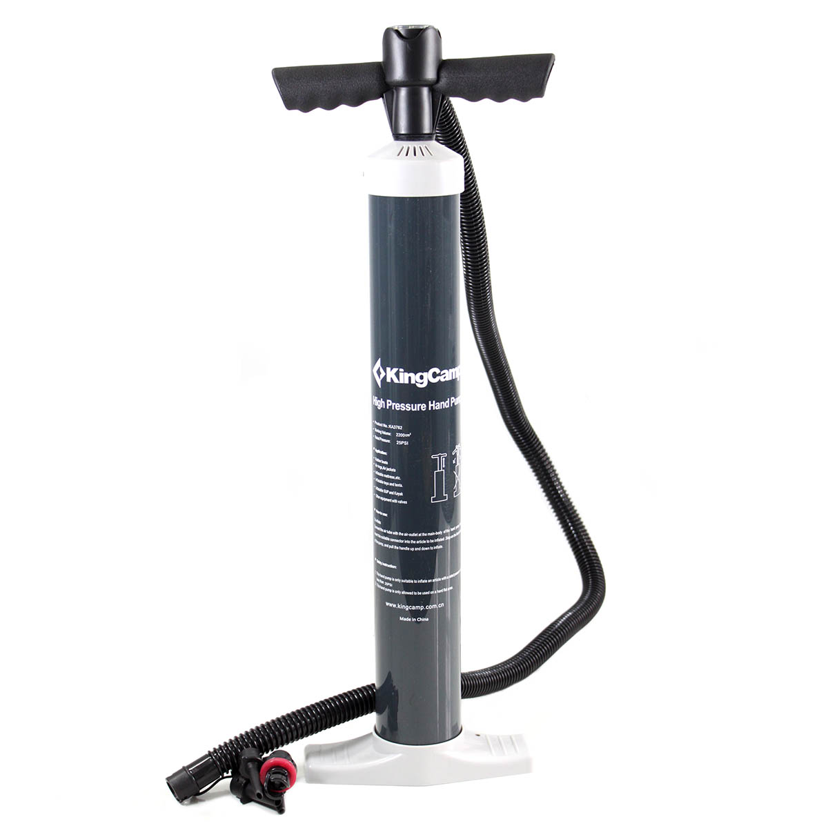 Bomba de mano de alta presión para colchón de aire KingCamp High Pressure Hand Pump KA3762. Incluye cuatro boquillas para adaptarse al estilo de su válvula.