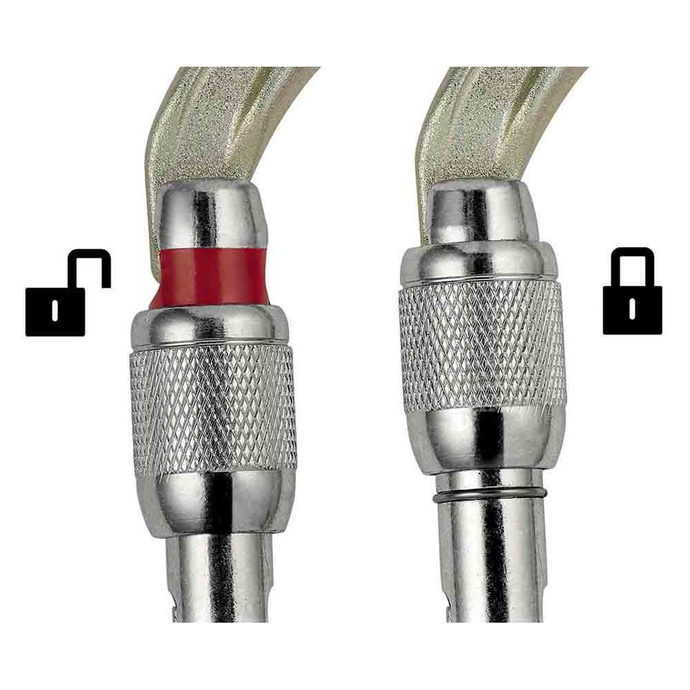 – SCREW-LOCK: bloqueo manual a rosca con indicador rojo visible cuando el mosquetón no está bloqueado. - Disponible en versiones europea e internacional.