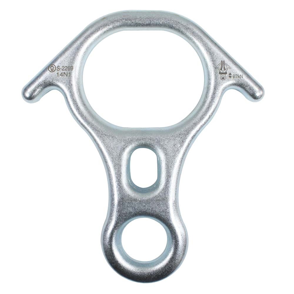 Descensor en ocho de grandes dimensiones ideal para rescates y con brazos antibloqueo para evitar que se haga una alondra.